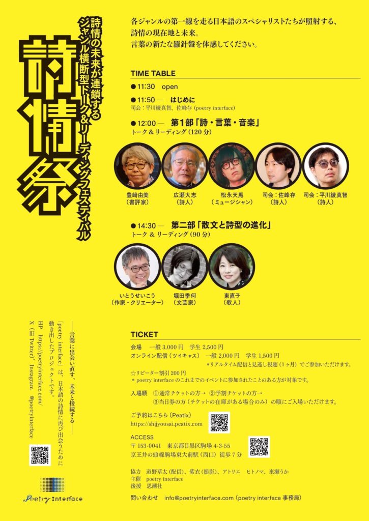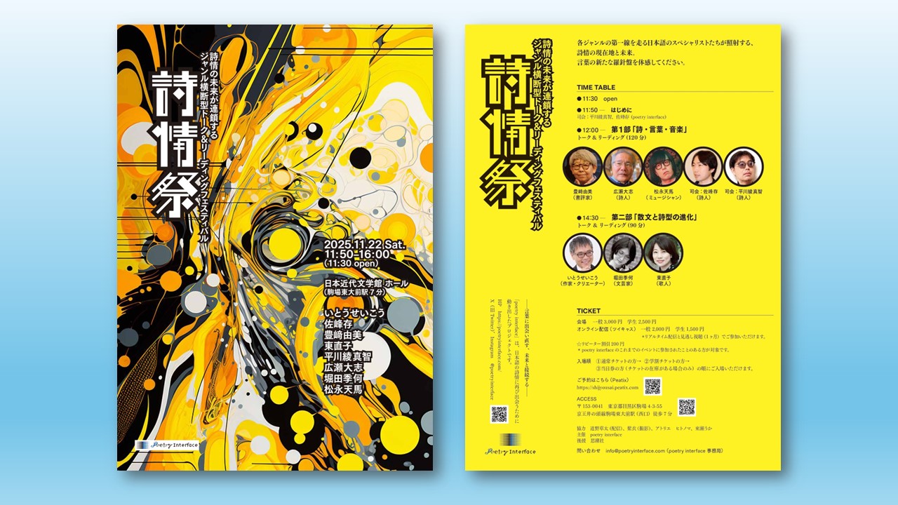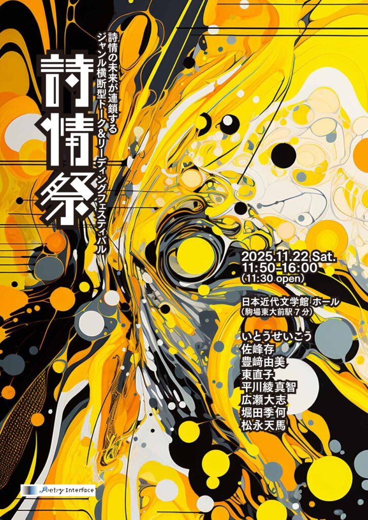 poetry interfaceのイベント「詩情の未来が連鎖するーージャンル横断型トーク&リーディングフェスティバル『詩情祭』」が、2025年11月22日(土)日本近代文学館ホールとオンラインにて開催される。