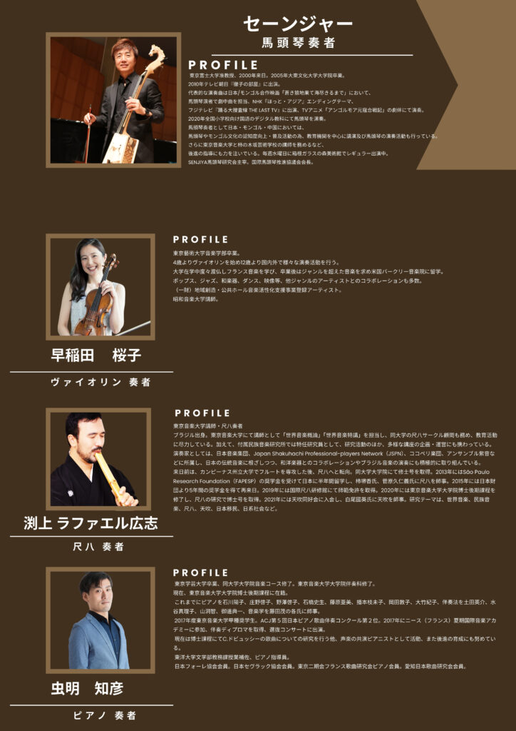 共演は、早稲田桜子(ヴァイオリン)、虫明知彦(ピアノ)、渕上ラファエル広志(尺八)の3名。