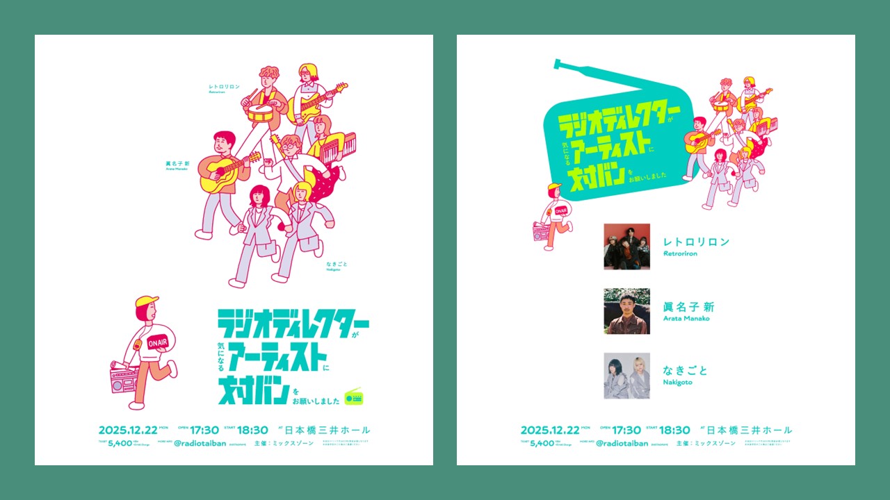 2025年12月22日 東京・日本橋三井ホールで開催「ラジオディレクターが気になるアーティストに対バンをお願いしました」に出演する3組のアーティストのコメント+選出したラジオディレクターのコメントを紹介。