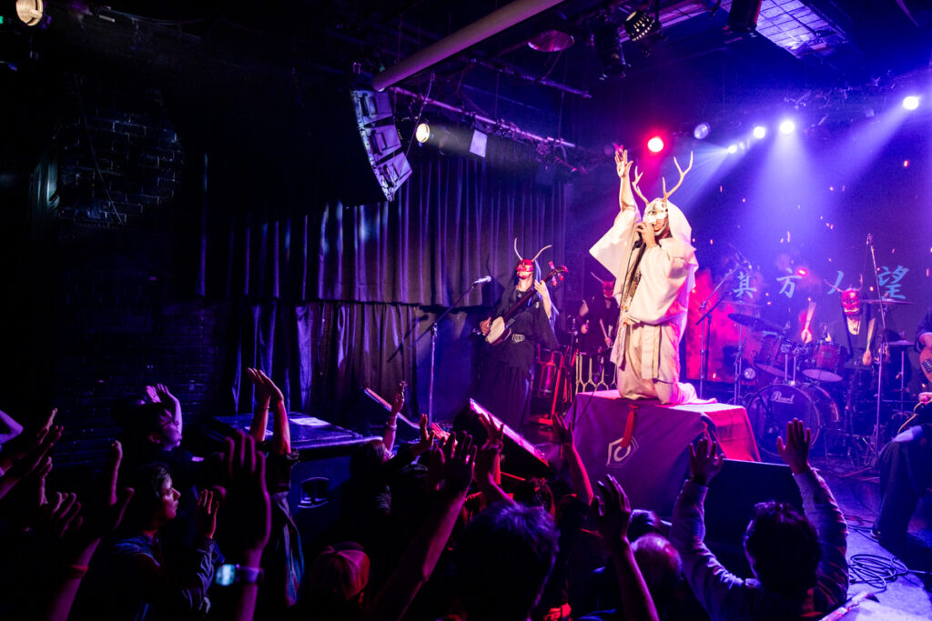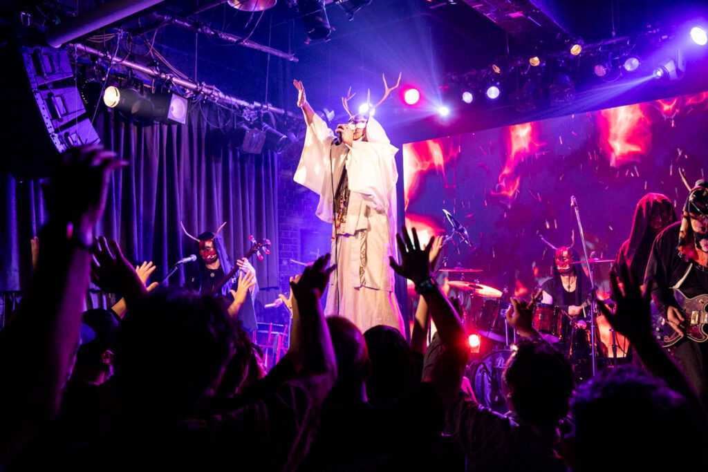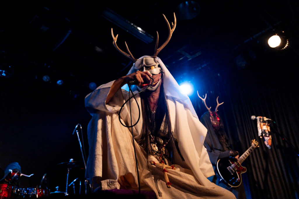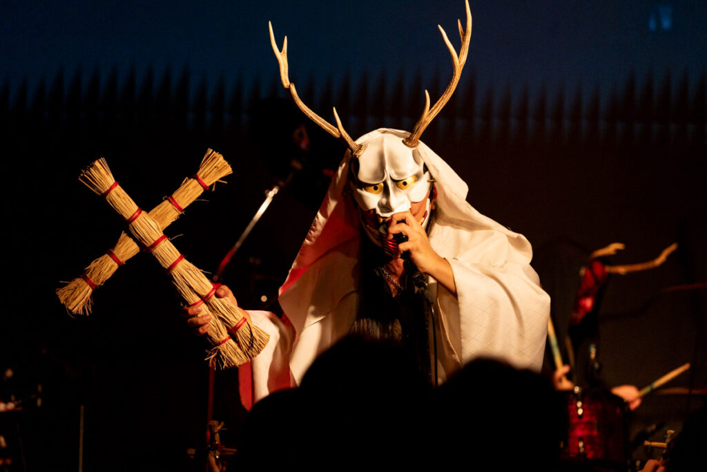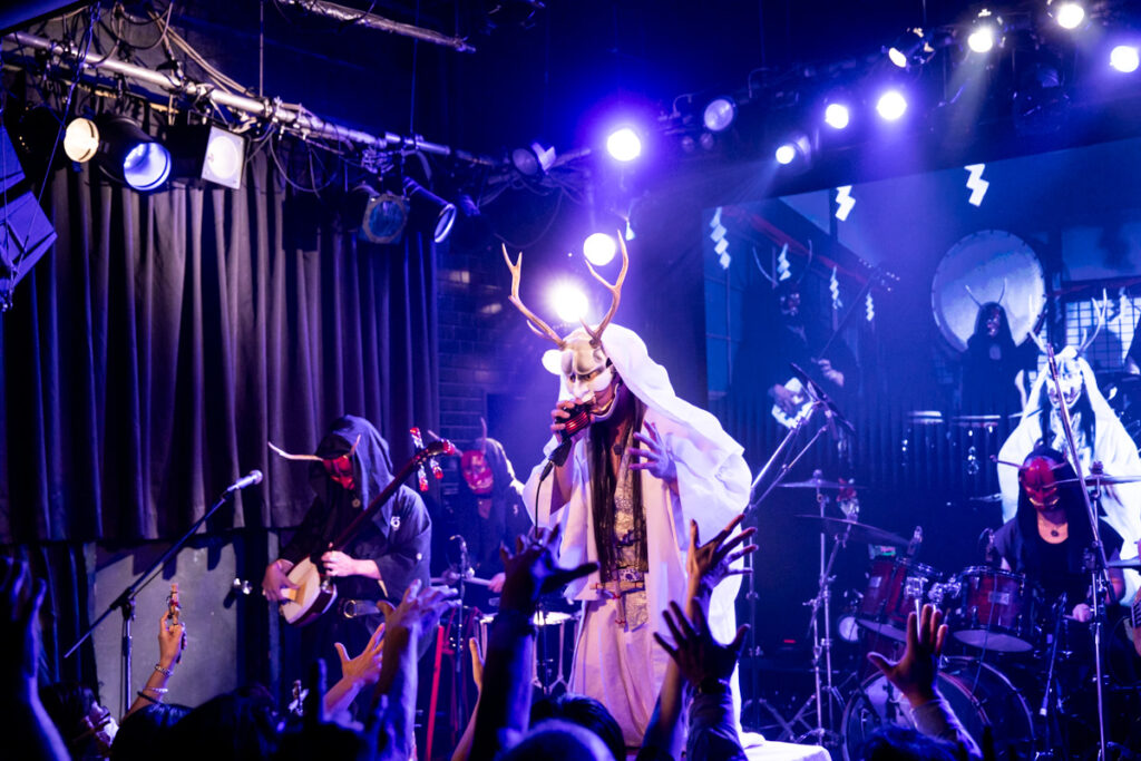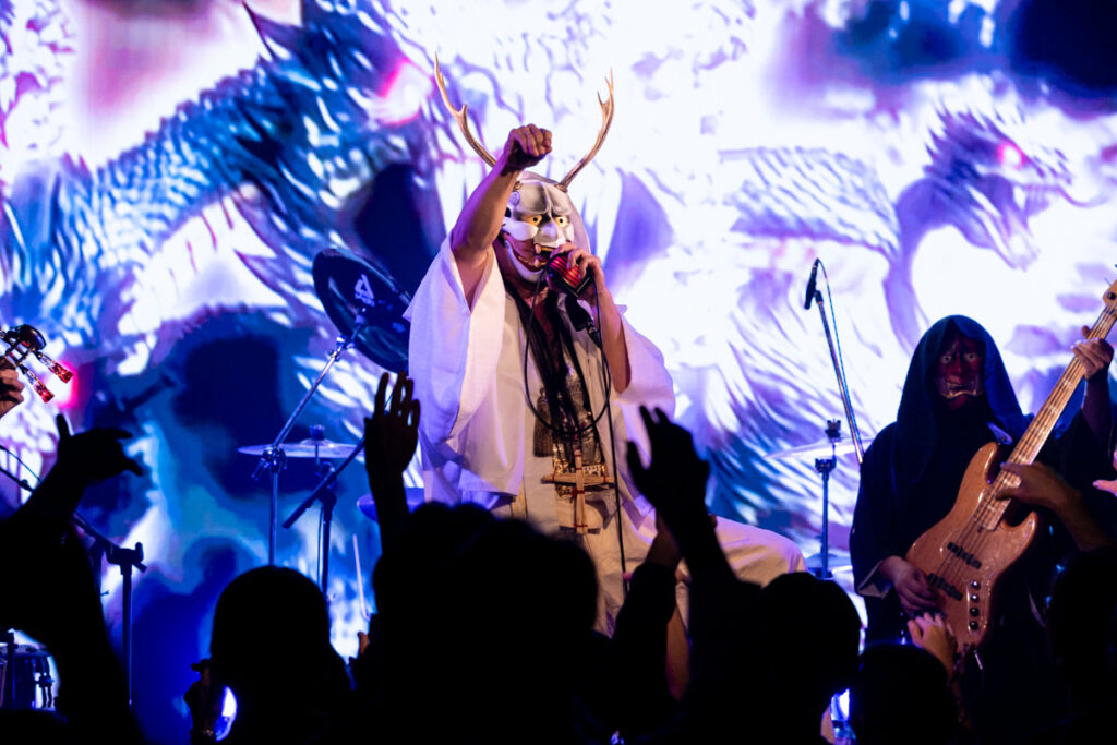 藁人形をかざしたり、オーディエンスをひれ伏せさせたり、おどろおどろしい雰囲気のバンド…と 思いきや、直前にソーシャルメディアで話題になっていたバンドマンあるあるネタをつっこんだ自虐感のあるMCを交えるなど、迫力の演奏+笑いと言うエンタメ要素満載のステージで会場を大いに沸かせた。