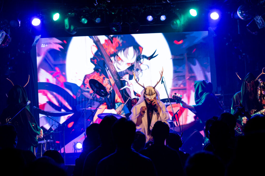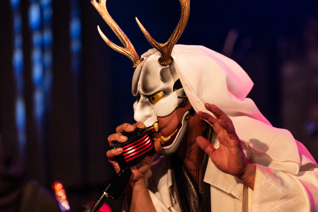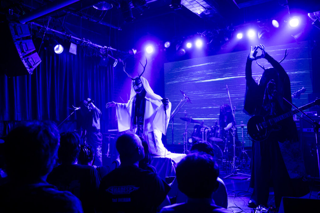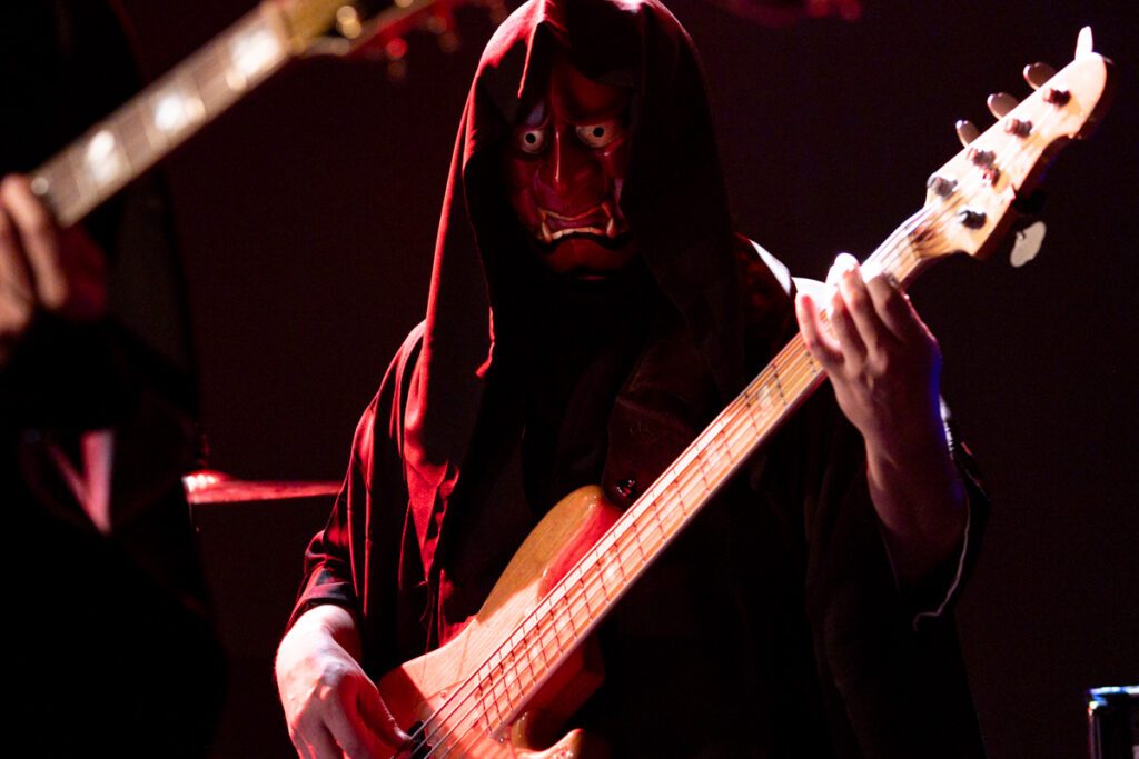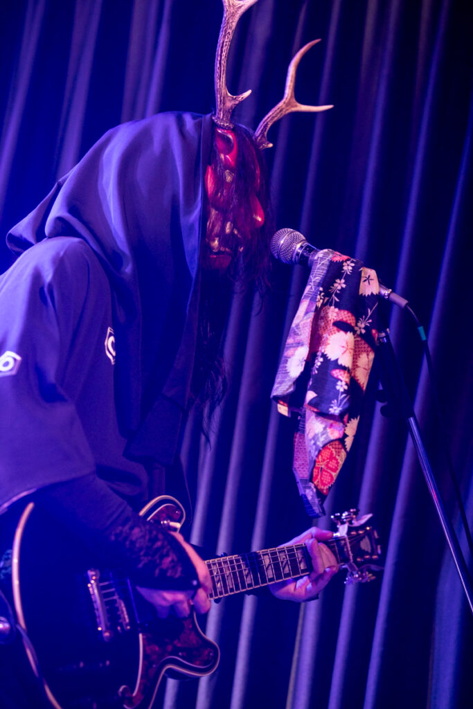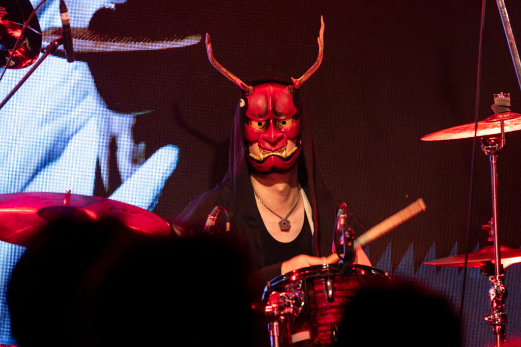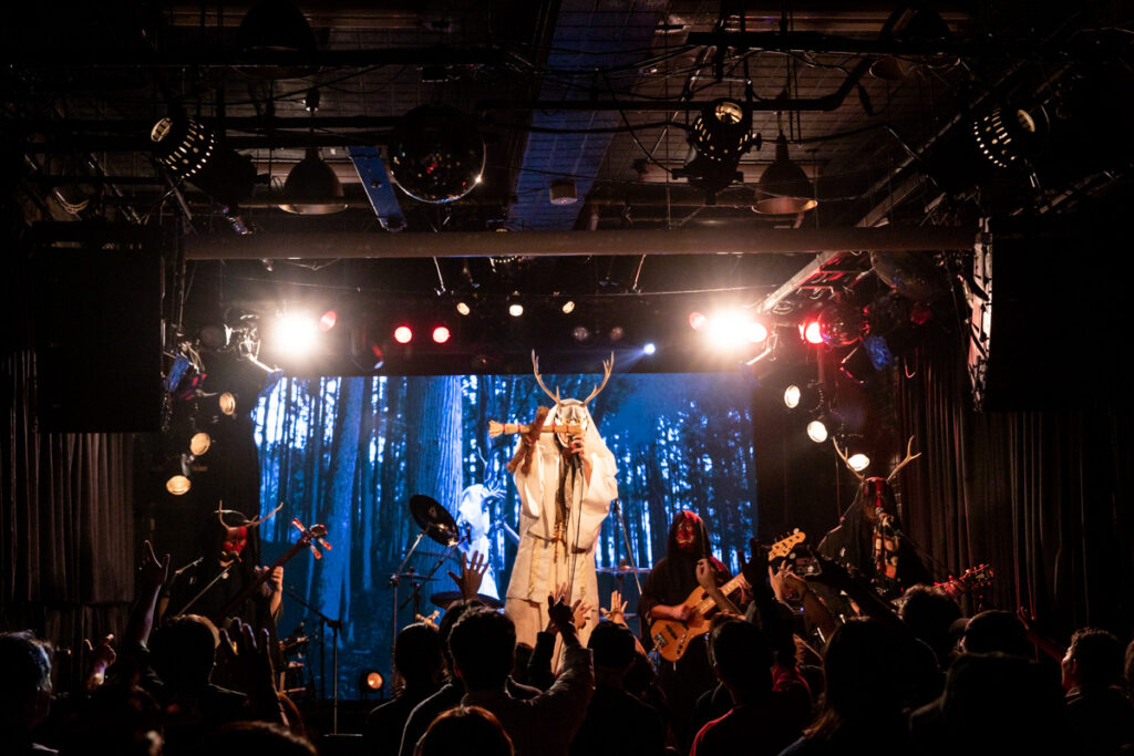 藁人形をかざしたり、オーディエンスをひれ伏せさせたり、おどろおどろしい雰囲気のバンド…と 思いきや、直前にソーシャルメディアで話題になっていたバンドマンあるあるネタをつっこんだ自虐感のあるMCを交えるなど、迫力の演奏+笑いと言うエンタメ要素満載のステージで会場を大いに沸かせた。