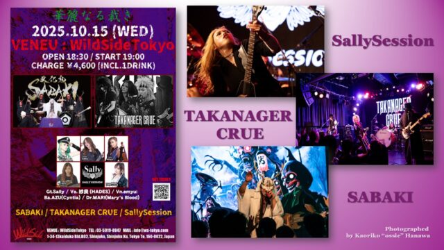 2025年10月15日 新宿 Wild Side Tokyoにて開催された「華麗なる裁き」。出演はSally率いる凄腕ギャルぞろいのセッションユニット「SallySession」、HIMAWARIを中心に濃いメンバーで結成された「TAKANAGER CRUE」、和メタルBAND「SABAKI」。この個性派3バンドによる濃いイベントの様子をフォトレポにてお届けする。Photo by Kaoriko “ossie” Hanawa