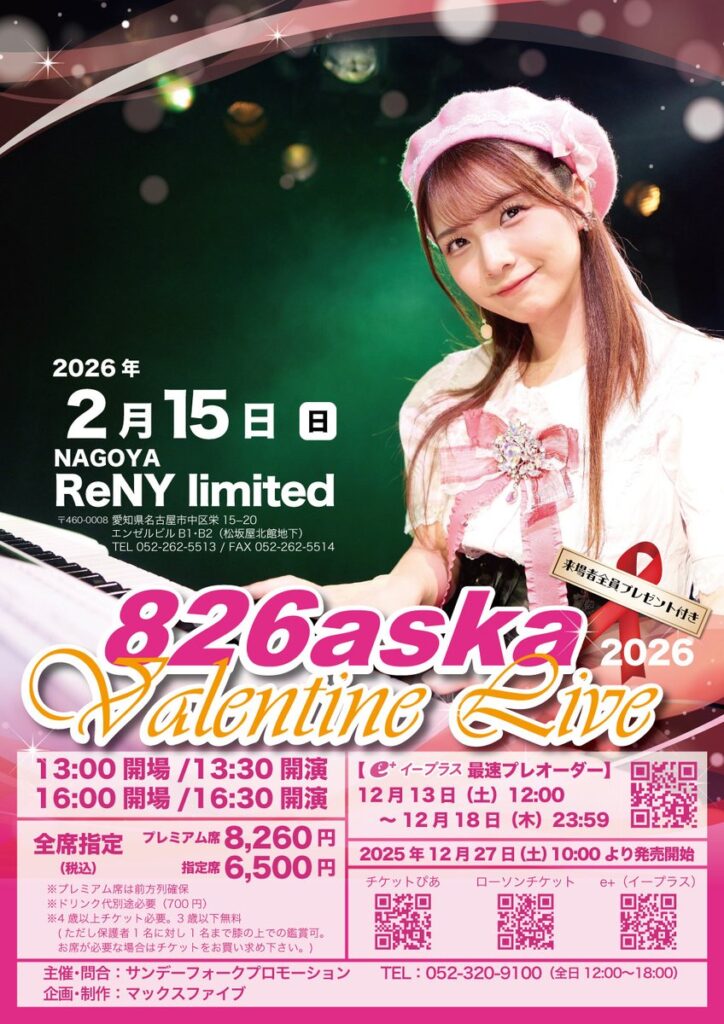 エレクトーンプレイヤー 826aska(はちにいろくあすか)が、大好評の恒例公演 「Valentine Live」を、名古屋ReNY limitedにて2026年2月15日 開催する事を発表。チケットはイープラス最速プレオーダー先行が2025年12月18日23:59まで実施。