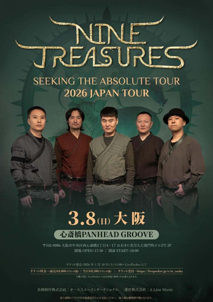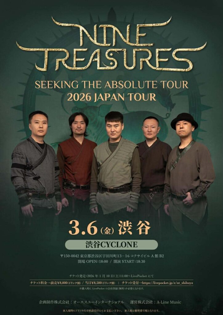 「NINE TREASURES SEEKING THE ABSOLUTE TOUR 2026 JAPAN TOUR」は、2026年3月6日東京・渋谷CYCLONE、3月7日名古屋 今池GROW、3月8日 大阪 心斎橋PANHEAD GROOVEにて開催。
