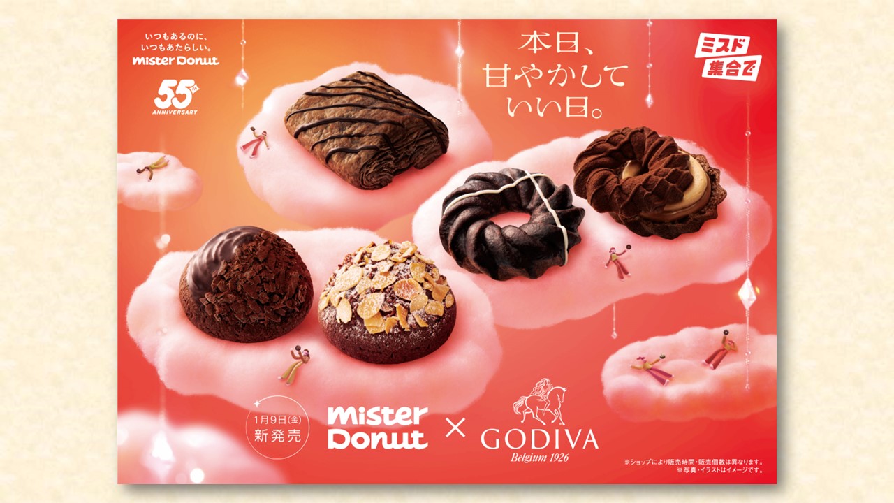 日本での創業から55周年を迎えたミスタードーナツと、1926年創業 100周年を迎えたゴディバが共に仕上げた特別なアニバーサリーコレクション『Mister Donut×GODIVA』全5種類を、2026年1月9日から期間限定で発売する。