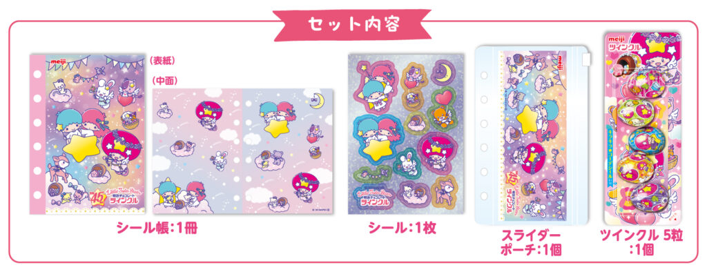 2026年2月17日に発売された、ツインクル×リトルツインスターズ お星さまのシール帳セットは、リニューアル後のツインクルと、限定デザインの3つのシールグッズがセットになっており、リトルツインスターズとお友だちがツインクルちゃんをお祝いする今だけの限定デザインとなっているとのこと。