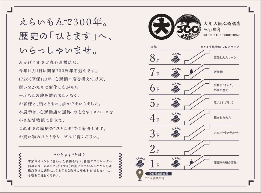 大丸心斎橋店が開業300周年企画を2026年3月6日~11月26日まで開催。4月2日までの期間は「歴史」をテーマに、大丸心斎橋店の歴史を展示する「ひとます博物館」をはじめ、各レストランが提供する「春のおとな様ランチ」、手塚治虫のマンガ『火の鳥』とのコラボ切手のプレゼント企画などを実施。