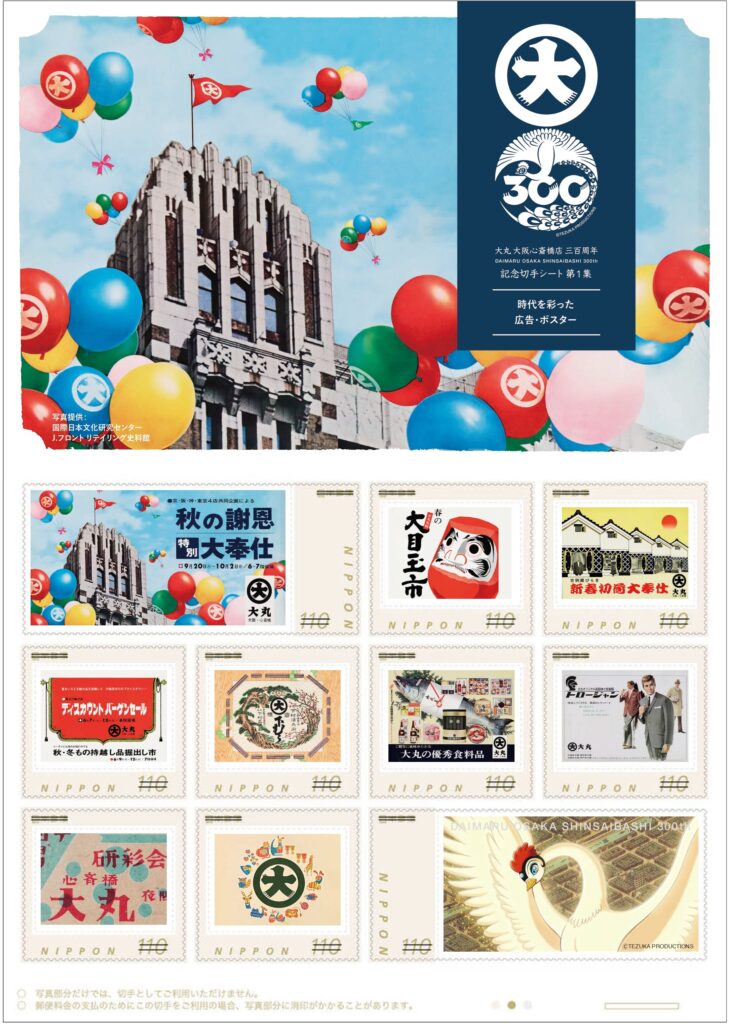 切手には大丸心斎橋店の昭和の広告やポスター、手塚治虫のマンガ『火の鳥』がデザインされてる。
