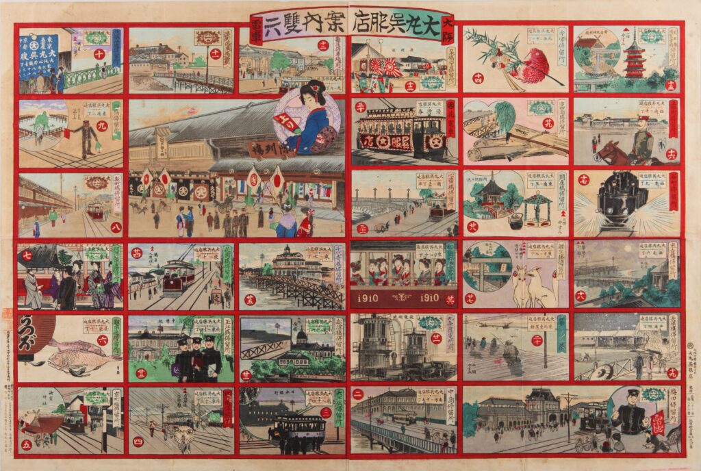 明治期に実際に配っていた、双六のノベルティやパンフレットなどの販促物の実物を展示。双六の挿し絵から、当時の大阪の街の様子もお楽しみいただける。