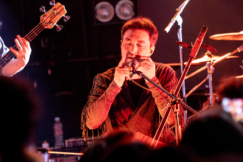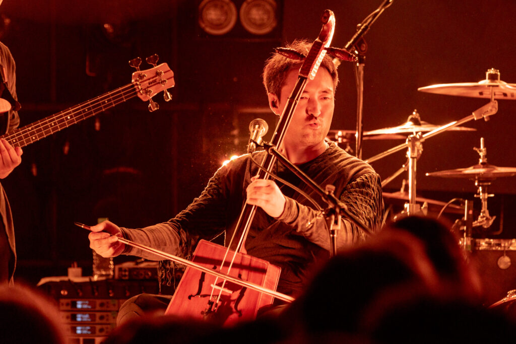 今回の公演は、ヴォーカルのAskhan(アスハーン)がエレキギターと持ち替えて演奏する、モンゴル民族楽器の1つで3弦のトプショール(Tovshuur)、Nars(ナラス)が演奏するチューニングの異なる3本の馬頭琴(morin khuur・モリンホール)と口琴、そしてギターも演奏するSaina(サイナ)による三角形のボディーのバラライカ(Balalaika)、といった日本ではめったに見られないモンゴル民族・文化に由来する楽器がふんだんに用いられた編成となっていた。