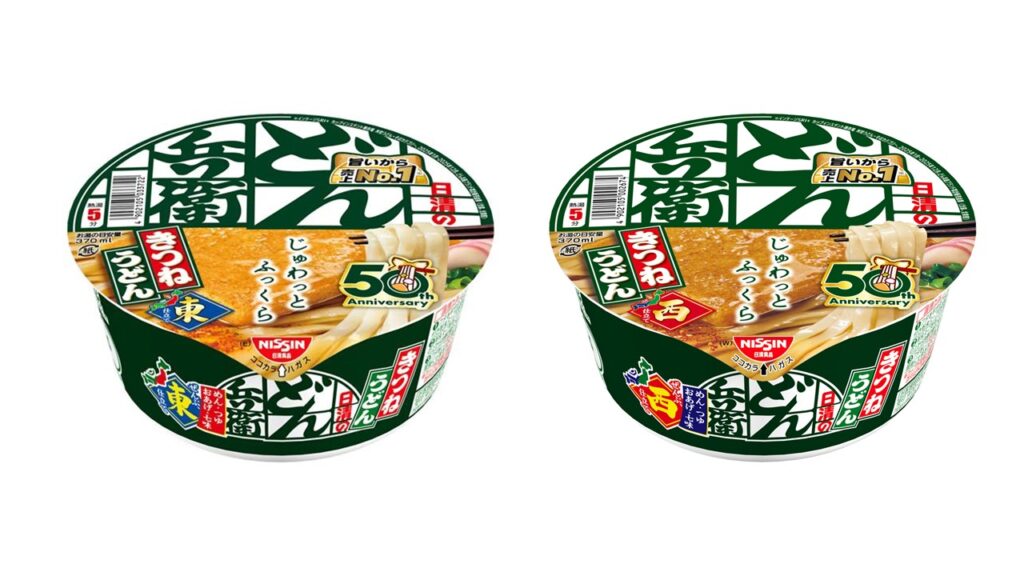 うどんやそばには、歴史的に東西で味の嗜好に違いがあることから、「どん兵衛」は全国展開のカップ麺としては初めて、つゆの味を東日本と西日本で分けて発売。