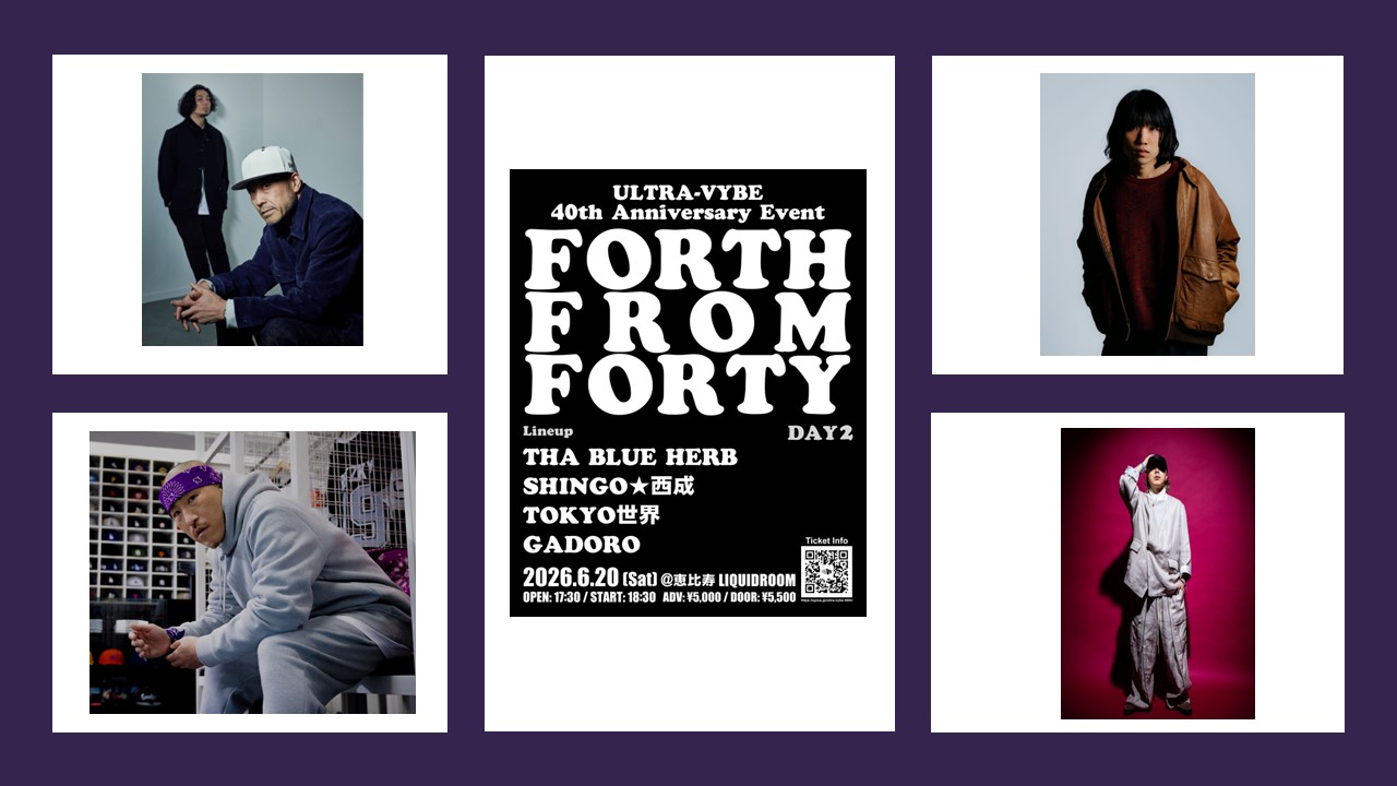 2026年6月20日開催「ULTRA-VYBE 40th Anniversary Event “FORTH FROM FORTY” DAY2」には、THA BLUE HERB、SHINGO★西成、TOKYO世界、GADOROの4組が出演。それぞれ40分ずつのライブを披露するとのこと。