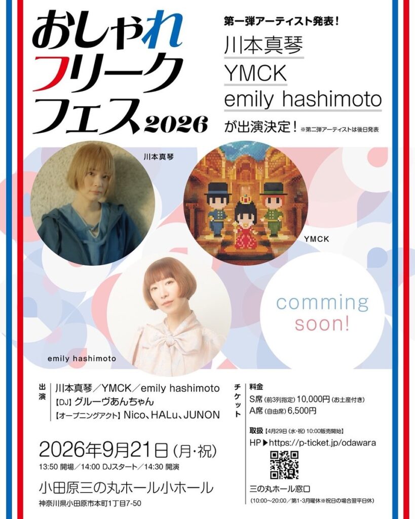 シンガーソングライター emily hashimotoによる、全国41局放送中のラジオ番組「EmiLyのおしゃれフリーク」放送200回を記念したイベント「おしゃれフリーク・フェス」が、2026年9月21日 小田原三の丸ホールにて開催される。第1弾として emily hashimoto, 川本真琴, YMCKの出演が発表された。チケットは4月29日より発売。